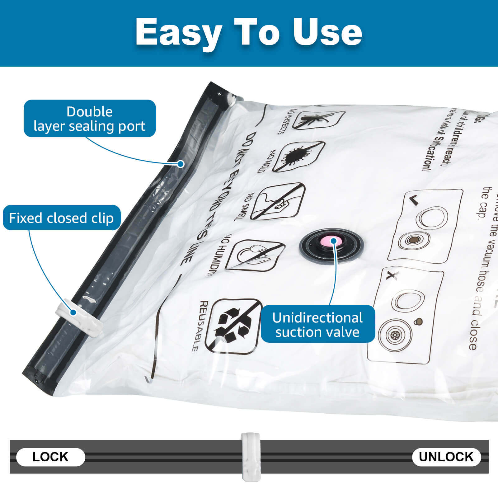This product features a dual zipper design, triple sealed turbo valve, airtight, and can be reused multiple times. It is waterproof, moisture-proof, insect proof, and dustproof, effectively protecting your clothing. The vacuum ports of these vacuum bags are compatible with most vacuum hose on the market, enable you to vacuum the bags in a minute. It can be stacked and used to store items well. Suitable for quilts, seasonal clothing, clothing that needs to be changed when traveling, extra blankets, pillows, old clothes, yard mats, and any soft products you can think of at home. It can save family storage space and is also a must-have for travel. The wide range of sizes makes it suitable for storing the whole family's clothes and more, you don't have to spend money on vacuum bags!